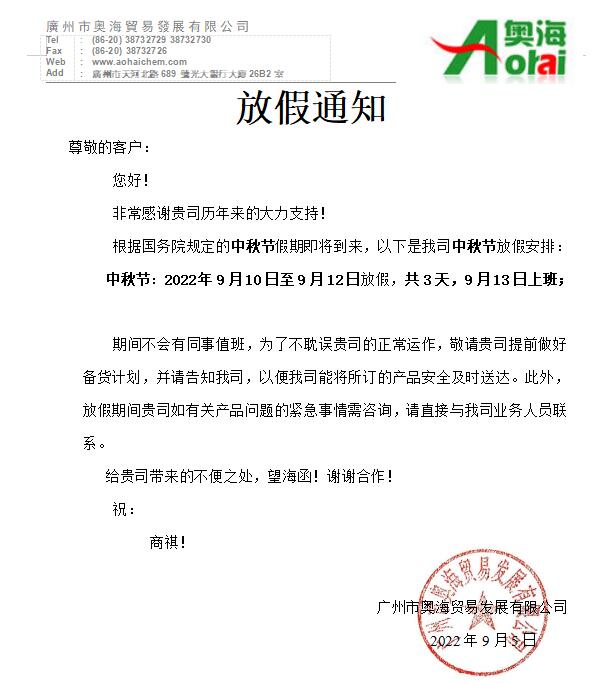 奧海公司2022年中秋節放(fàng)假通知