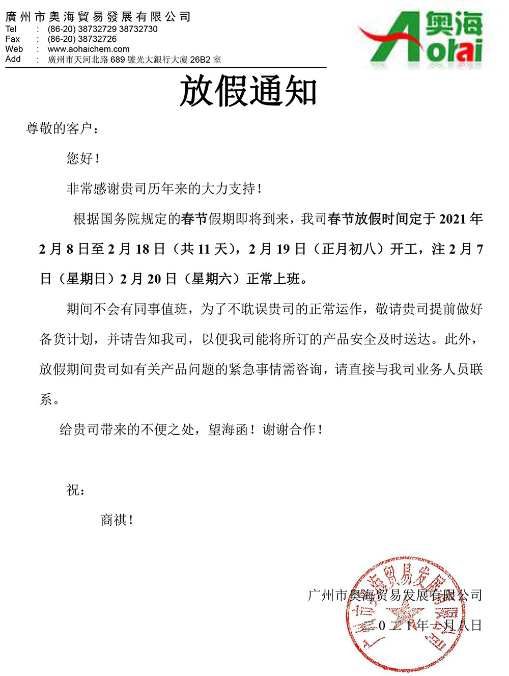 廣州奧海-2021假期通知(春節)