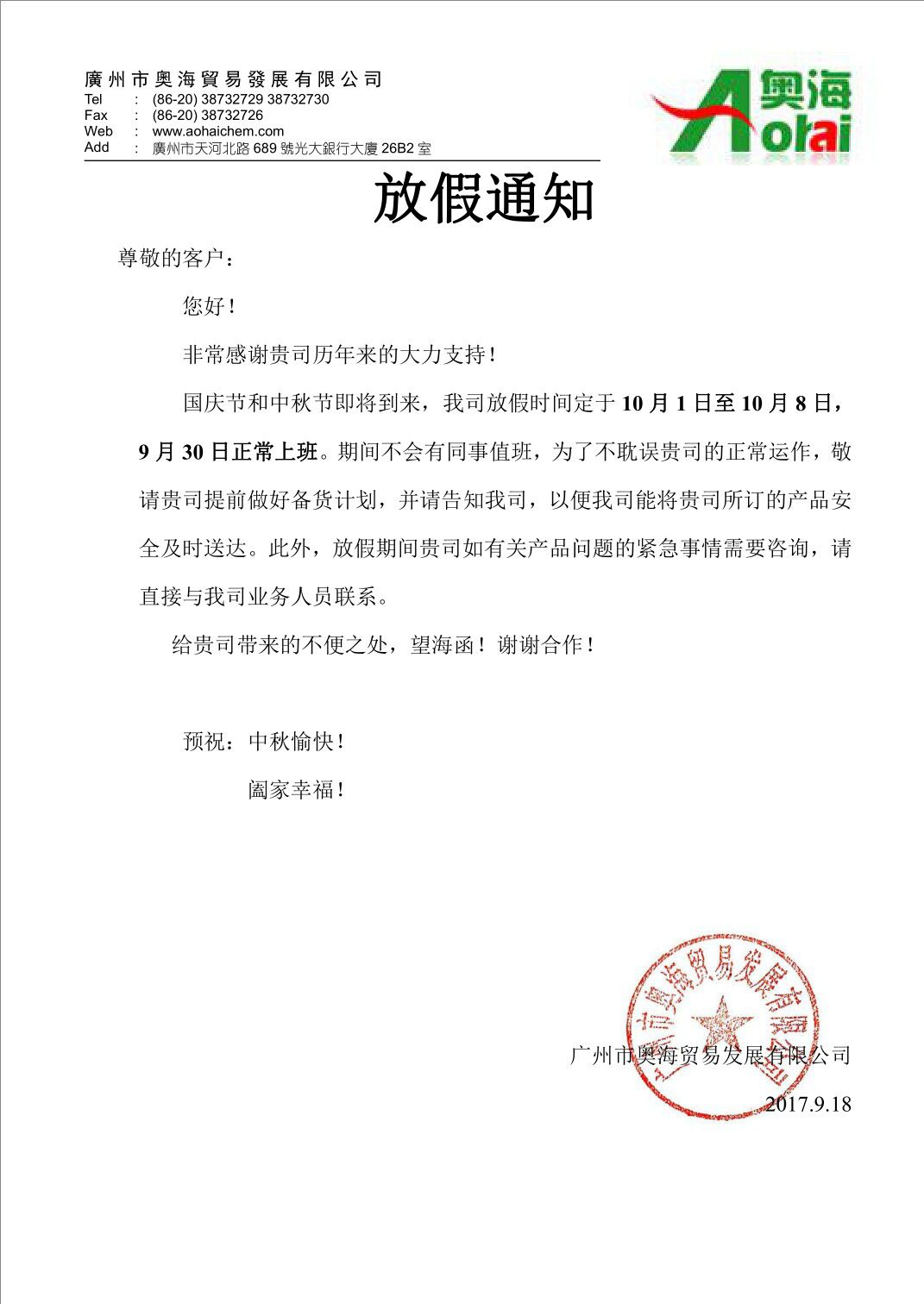 2017年廣州市(shì)奧海公司中秋國慶放(fàng)假通知